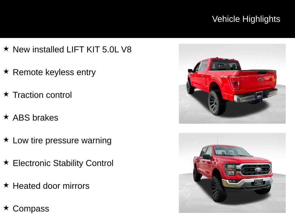 4WD, ABS brakes, Alloy wheels, Compass, Electronic Stability Control, Extended Range 36 Gallon Fuel Tank, Heated door mirrors, Illuminated entry, Low tire pressure warning, Remote keyless entry, Traction control, 2-Bar Style Grille w/Chrome 2 Minor Bars, 3.31 Axle Ratio, 4-Wheel Disc Brakes, 6 Speakers, Air Conditioning, AM/FM radio, Auto High-beam Headlights, Brake assist, Bright Polished Step Bars, Bumpers: chrome, Chrome Door & Tailgate Handles w/Body-Color Bezel, Chrome Single-Tip Exhaust, Class IV Trailer Hitch Receiver, Cloth 40/20/40 Front Seat, Delay-off headlights, Driver door bin, Driver vanity mirror, Dual front impact airbags, Dual front side impact airbags, Emergency communication system: SYNC 4 911 Assist, Exterior Parking Camera Rear, Front anti-roll bar, Front Center Armrest w/Storage, Front fog lights, Front reading lights, Front wheel independent suspension, Fully automatic headlights, GVWR: 7,050 lbs Payload Package, Integrated Trailer Brake Controller, Occupant sensing airbag, Outside temperature display, Overhead airbag, Overhead console, Panic alarm, Passenger door bin, Passenger vanity mirror, Power door mirrors, Power steering, Power windows, Pro Trailer Backup Assist & Pro Trailer Hitch Assist, Radio data system, Radio: AM/FM Stereo w/6 Speakers, Rear reading lights, Rear step bumper, Rear window defroster, Security system, Speed control, Speed-sensing steering, Split folding rear seat, Steering wheel mounted audio controls, SYNC 4, Tachometer, Telescoping steering wheel, Tilt steering wheel, Trailer Tow Package, Trip computer, Variably intermittent wipers, Voltmeter, Wheels: 17" Silver Painted Aluminum, Wheels: 18" Chrome-Like PVD, XLT Chrome Appearance Package, New installed LIFT KIT 5.0L V8, 4WD, ABS brakes, Alloy wheels, Compass, Electronic Stability Control, Extended Range 36 Gallon Fuel Tank, Heated door mirrors, Illuminated entry, Low tire pressure warning, Remote keyless entry, Traction control.