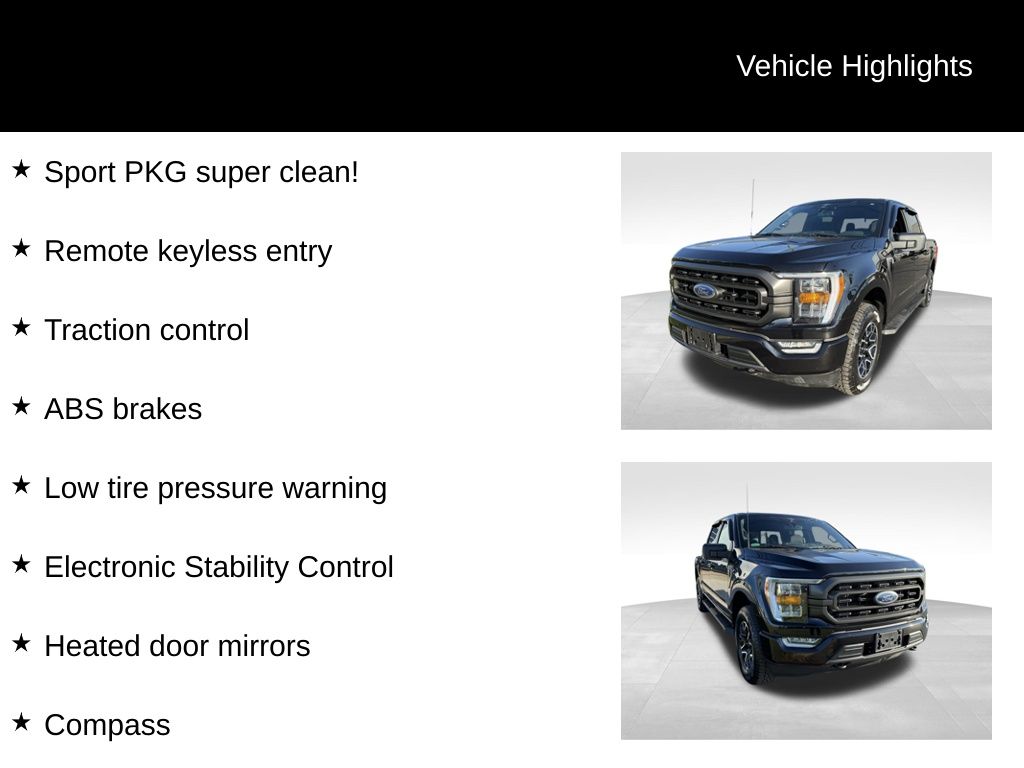 4WD, ABS brakes, Alloy wheels, Compass, Electronic Stability Control, Heated door mirrors, Illuminated entry, Low tire pressure warning, Remote keyless entry, Traction control, 10-Way Power Driver & Passenger Seats, 3.73 Axle Ratio, 4-Wheel Disc Brakes, 6 Speakers, 8" Productivity Screen in Instrument Cluster, Accent-Color Step Bars, Air Conditioning, AM/FM radio, Auto High-beam Headlights, Auto-Dimming Rear-View Mirror, Black 2-Bar Style Grille w/Black Surround/Accents, Body-Color Door & Tailgate Handles, Body-Color Front & Rear Bumpers, Box Side Decals, Brake assist, Bumpers: chrome, Class IV Trailer Hitch Receiver, Cloth 40/20/40 Front Seat, Delay-off headlights, Driver door bin, Driver vanity mirror, Dual front impact airbags, Dual front side impact airbags, Dual Zone Electronic Automatic Temperature Control, Emergency communication system: SYNC 4 911 Assist, Equipment Group 302A High, Exterior Parking Camera Rear, Front anti-roll bar, Front Center Armrest w/Storage, Front fog lights, Front reading lights, Front wheel independent suspension, Fully automatic headlights, GVWR: 6,470 lbs Payload Package, Heated Front Seats, Intelligent Access w/Push Button Start, LED Reflector Headlamps, LED Sideview Mirror Spotlights, Occupant sensing airbag, Onboard 400W Outlet, Outside temperature display, Overhead airbag, Overhead console, Panic alarm, Passenger door bin, Passenger vanity mirror, Power door mirrors, Power Glass Heated Sideview Mirrors, Power steering, Power windows, Radio data system, Radio: AM/FM SiriusXM w/360L, Radio: AM/FM Stereo w/6 Speakers, Rear reading lights, Rear step bumper, Rear Under-Seat Storage, Rear window defroster, Remote Start System w/Remote Tailgate Release, SecuriCode Drivers Side Keyless-Entry Keypad, Security system, Speed control, Speed-sensing steering, Split folding rear seat, Steering wheel mounted audio controls, SYNC 4, SYNC 4 w/Enhanced Voice Recognition, Tachometer, Telescoping steering wheel, Tilt steering wheel, Trip computer, Unique Sport Cloth 40/Console/40 Front-Seats, Variably intermittent wipers, Voltmeter, Wheels: 17" Silver Painted Aluminum, Wheels: 18" 6-Spoke Machined Aluminum, Wrapped Steering Wheel, XLT Sport Appearance Package, Zone Lighting, Sport PKG super clean!, 4WD, ABS brakes, Alloy wheels, Compass, Electronic Stability Control, Heated door mirrors, Illuminated entry, Low tire pressure warning, Remote keyless entry, Traction control.