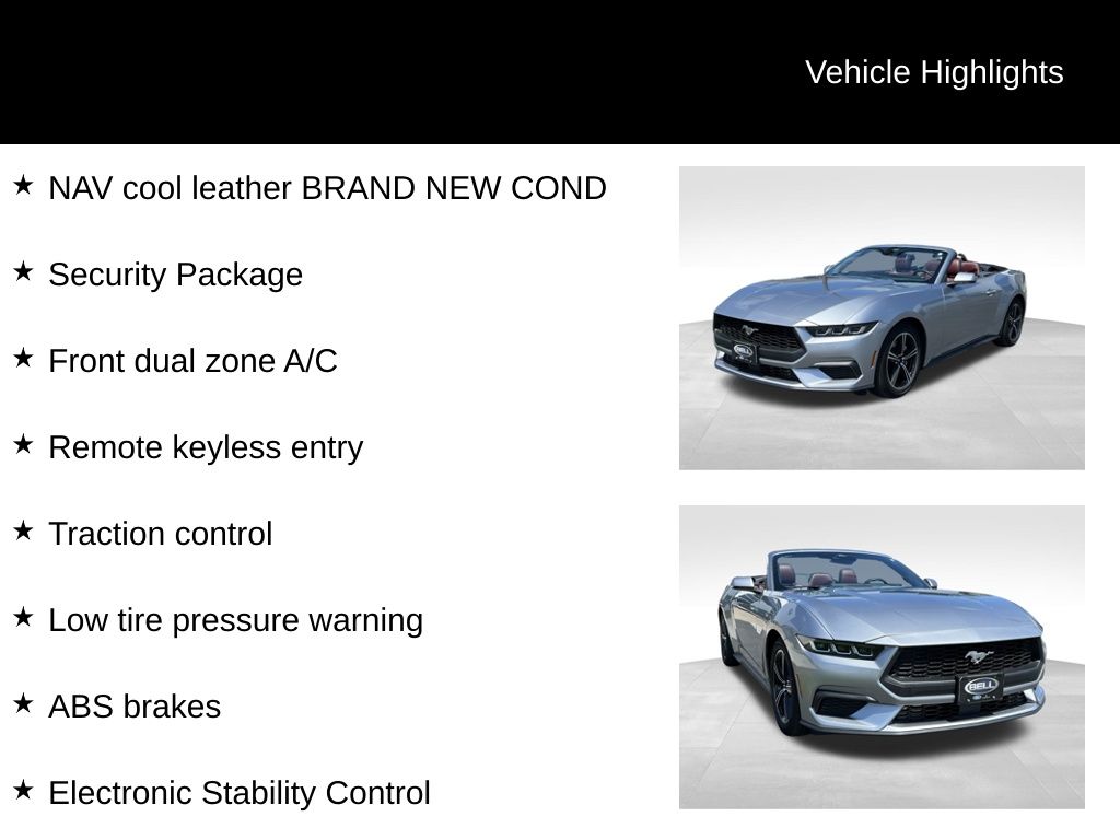 ABS brakes, Alloy wheels, Compass, Electronic Stability Control, Front dual zone A/C, Heated door mirrors, Heated front seats, Illuminated entry, Low tire pressure warning, Remote keyless entry, Security Package, Traction control, 4-Wheel Disc Brakes, 9 Speakers, Active Anti-Theft System, ActiveX Bucket Seats, Air Conditioning, AM/FM radio: SiriusXM with 360L, AM/FM Stereo, Auto High-beam Headlights, Auto-dimming Rear-View mirror, Automatic temperature control, Brake assist, Bumpers: body-color, Climate Controlled Heated/Cooled Front Seats, Convertible roof lining, Delay-off headlights, Driver door bin, Driver vanity mirror, Dual front impact airbags, Dual front side impact airbags, Emergency communication system: 911 Assist, Exterior Parking Camera Rear, Four wheel independent suspension, Front anti-roll bar, Front Bucket Seats, Front Center Armrest, Front reading lights, Fully automatic headlights, Glass rear window, HD Radio, Heated steering wheel, Knee airbag, Leather Shift Knob, Leather steering wheel, Locking Center Console, Occupant sensing airbag, Outside temperature display, Overhead console, Panic alarm, Passenger door bin, Passenger vanity mirror, Power convertible roof, Power door mirrors, Power driver seat, Power passenger seat, Power steering, Power windows, Radio data system, Rain sensing wipers, Rear anti-roll bar, Rear Parking Sensors, Rear window defroster, Security system, SiriusXM w/360L, Speed control, Speed-sensing steering, Speed-Sensitive Wipers, Spoiler, Sport steering wheel, Steering wheel mounted audio controls, SYNC 4.0 QNX, Tachometer, Telescoping steering wheel, Tilt steering wheel, Trip computer, Turn signal indicator mirrors, Variably intermittent wipers, Ventilated front seats, Voltmeter, Wheel Locking Kit, Wheels: 18" x 8" Machined-Face Aluminum, NAV cool leather BRAND NEW COND, ABS brakes, Alloy wheels, Compass, Electronic Stability Control, Front dual zone A/C, Heated door mirrors, Heated front seats, Illuminated entry, Low tire pressure warning, Remote keyless entry, Security Package, Traction control.